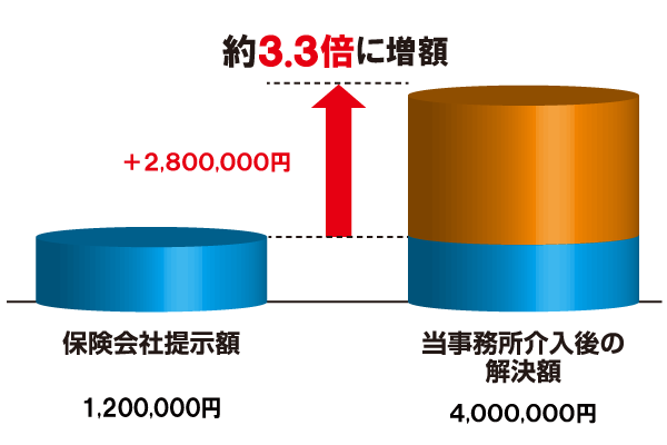 弁護士が交渉した結果、最終的に約400万円で示談解決となりました。保険会社提示額の約3.3倍に増額したことになります。