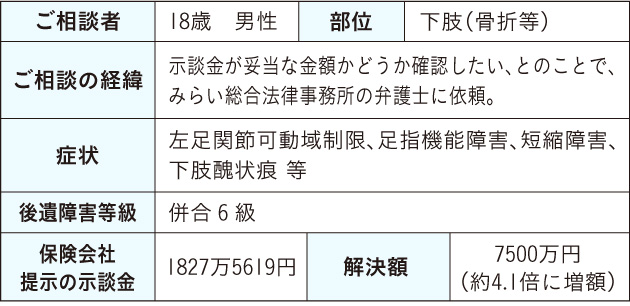 | ご相談の経緯 | 被害者は、保険会社と示談交渉中に、みらい総合法律事務所に示談交渉を依頼。 |
